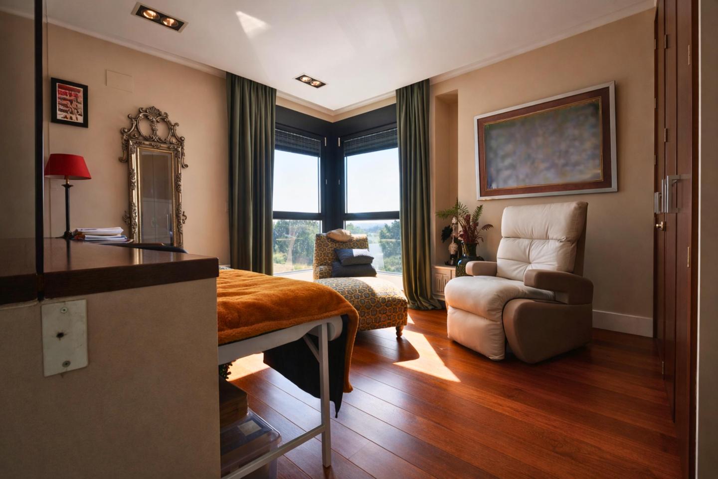 En la planta alta, se ubican dos dormitorios, destacando el dormitorio principal que cuenta con vestidor, zapatero, baño tipo suite con jacuzzi, ducha y doble lavabo, además de acceso a una magnífica terraza con vistas inmejorables, además de acceso a la azotea transitable con vistas panorámicas. Todos los dormitorios de la vivienda disponen de armarios empotrados de madera de alta calidad.